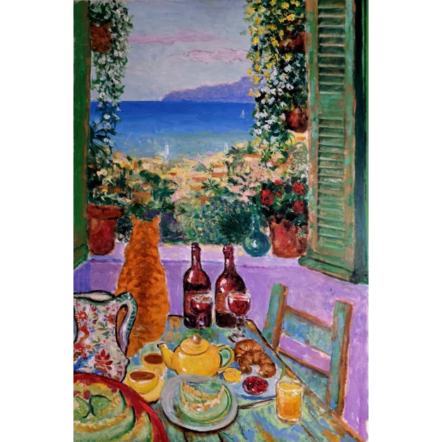A dreamy afternoon from a balcony overlooking the blue Mediterranean Sea, one of the recognizable works the artist has been creating in recent years. On the wall, it shines with its simplicity and purity.