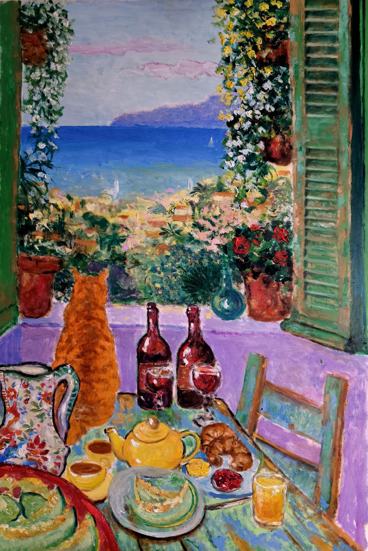 A dreamy afternoon from a balcony overlooking the blue Mediterranean Sea, one of the recognizable works the artist has been creating in recent years. On the wall, it shines with its simplicity and purity.