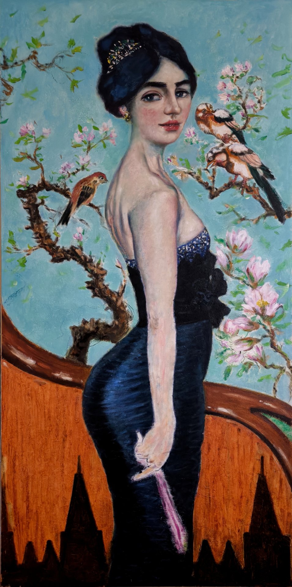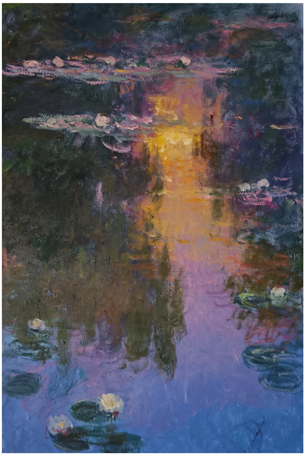 This painting is large and painted on thick, sturdy canvas. The blue-green creates a contemplative atmosphere of silence and beauty.